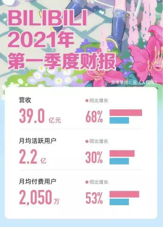 财报披露,B站Q1月活用户为2.23亿,同比增长30%。而根据历史数据,从2020年Q1到2020年Q4,B站的月活用户增速分别为70%、56%、54%、55%。
