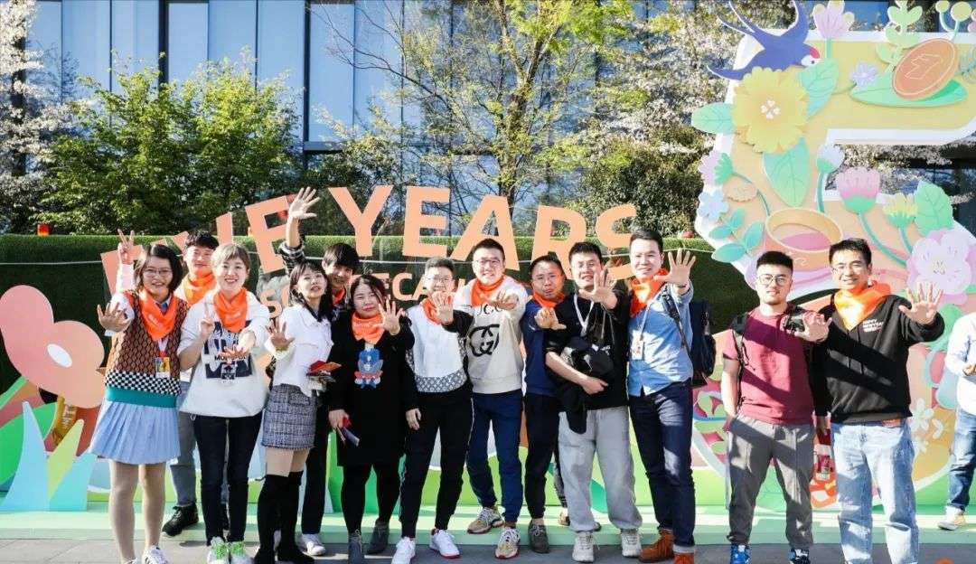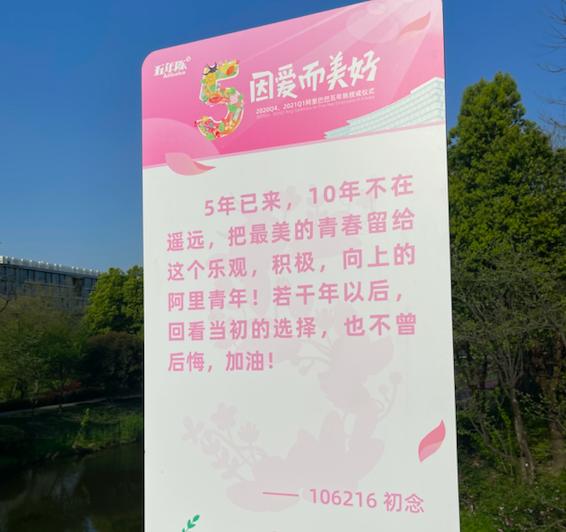 在阿里巴巴“五年陈”授戒的那几天,西溪园区彩旗飘扬,一些老员工的祝福随处可见。
