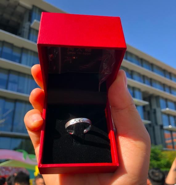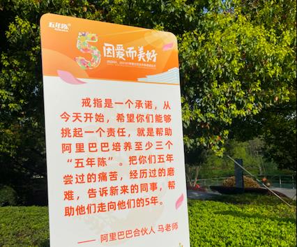 在阿里巴巴园区,阿里巴巴合伙人马老师的一段祝福被放在显眼位置,“戒指是一个承诺,从今天开始,希望你们能够挑起一个责任,就是帮助阿里巴巴培养至少三个五年陈。把你们五年尝过的痛苦,经历过的磨难,告诉新来的同事,帮助他们走向他们的5年。”
