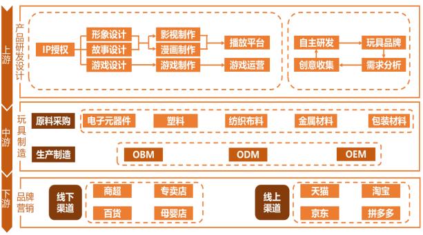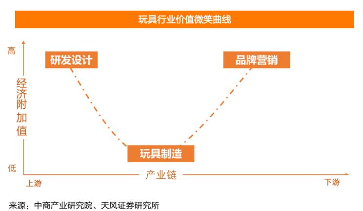 玩具行业产业链主要分为产品研发设计、生产制造、品牌营销三大环节。不同环节的经济附加值也各不相同,其中研发设计和品牌营销占据整个产业链的高端,经济附加值最高而生产制造则是低附加值环节。