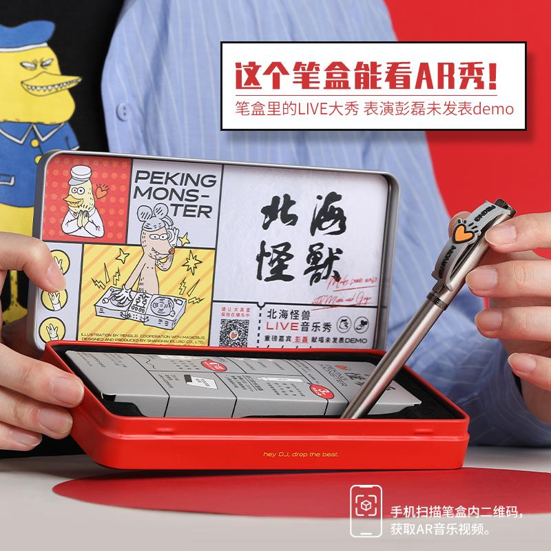 北海怪兽,是彭磊的自传漫画,打开这个大男孩画风的钢笔礼盒,手机扫码联动 AR,能看到北海怪兽 IP 咪咪嘎嘎的音乐首秀。