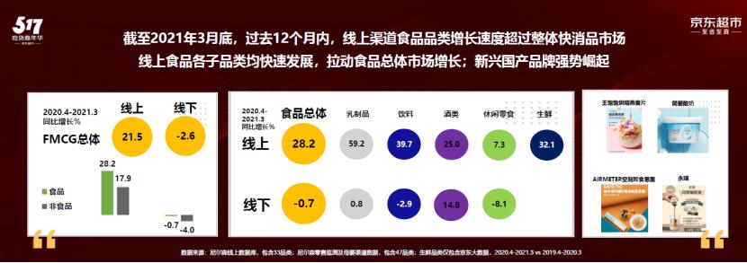 5月13日, 2021京东超市吃货嘉年华发布会上《2021食品行业消费新趋势洞察》(下称《报告》)的数据再次印证了这一现象:截至2021年3月底,在过去的12个月内,线上渠道大食品品类(涵盖食品、酒类、生鲜)增长速度超过整体快消品市场。