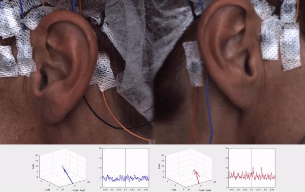耳朵的运动可能肉眼不容易看出,但是借助肌电图(EMG),研究人员能够记录控制耳朵运动(通常不可见)的信号。如下图所示,EMG是附在皮肤表面上的传感器,它能够检测到耳廓肌肉或形状的改变。
