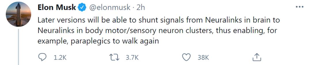 他还补充说,该产品的未来迭代版本将能够实现患者身体不同部位的神经链路之间的通信,例如在大脑内部结点和腿部神经通路之间传递信息,从而让截瘫患者再次行走成为可能。