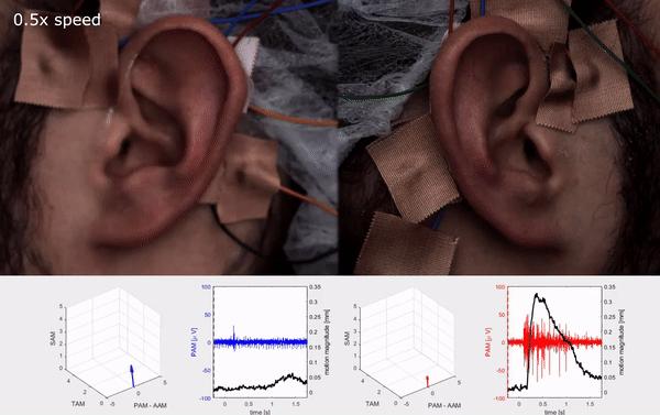 为了更好地描述耳朵的微小动作,研究小组在实验期间对受试者进行了特殊的高清录像。通过基于计算机的运动放大技术,耳朵的细微运动变得清晰可见,如下图所示:
