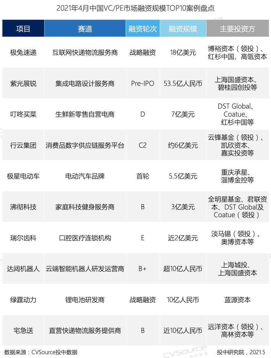 4月中国VC/PE市场最大一笔融资案例规模高达18亿美元,获投方为互联网快递物流服务商——极兔速递,由博裕资本领投5.8亿美元,红杉和高瓴跟投,投后估值78亿美元。