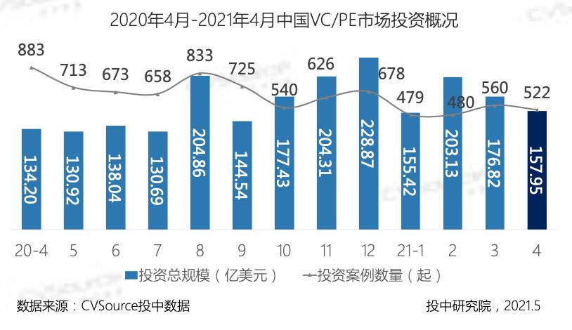 2021年4月,中国VC/PE市场投资案例数量522起,同比下降41%,环比下降7%,投资总规模157.95亿美元,同比增长18%,环比下降11%。
