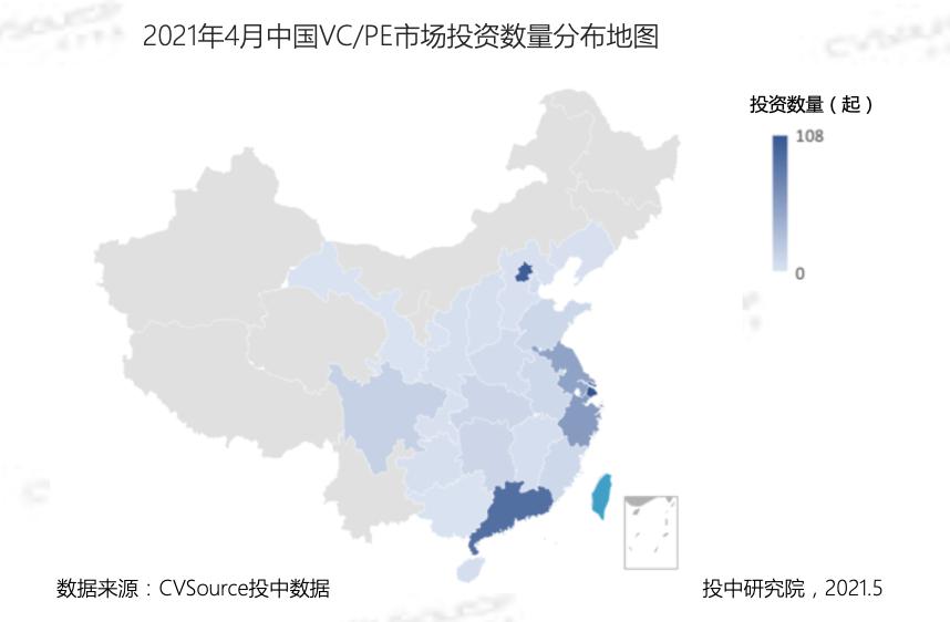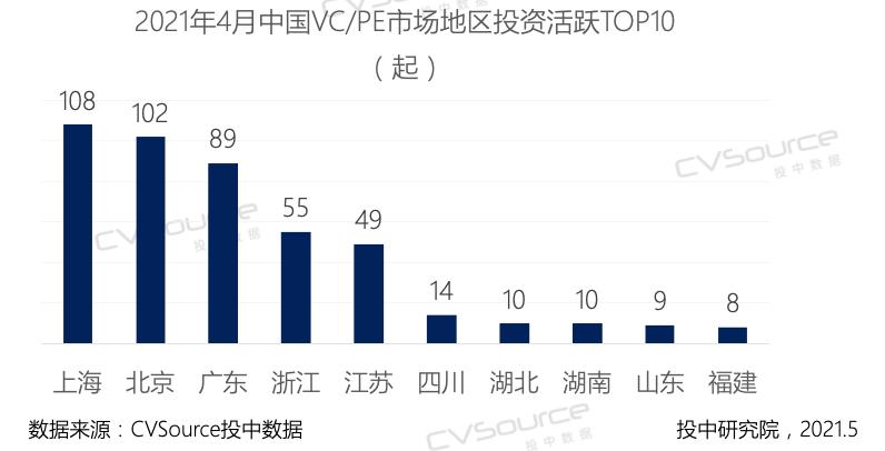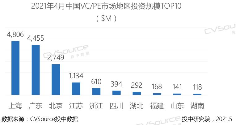 2021年4月,VC/PE市场投资活跃地区TOP3依次为上海、北京、广东,对应投资数量为108起、102起、89起;投资规模地区TOP3依次为上海、广东、北京,对应投资规模为48.06亿美元、44.55亿美元、27.49亿美元。