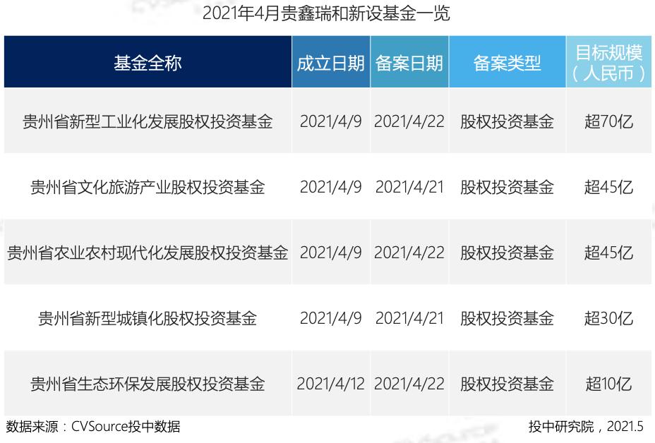 值得关注的一家机构为贵州省贵鑫瑞和创业投资管理有限责任公司(简称“贵鑫瑞和”),4月新设5支相对大规模基金,合计目标规模超200亿人民币,涉及投资领域包括文旅产业、农业农村现代化、生态环保等。根据AMAC披露数据,贵鑫瑞和成立于2014年7月,并于2015年8月完成登记,实控人为贵州金控。