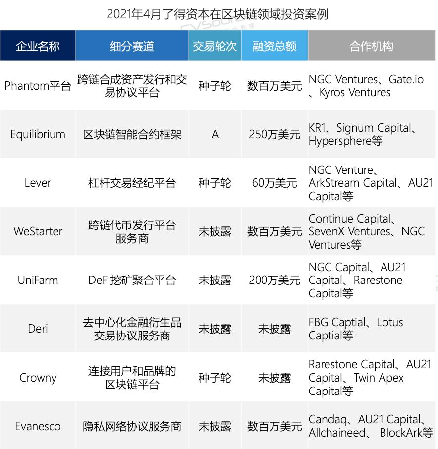 4月投资区块链较为活跃的机构有了得资本、共识实验室、FBG资本等。