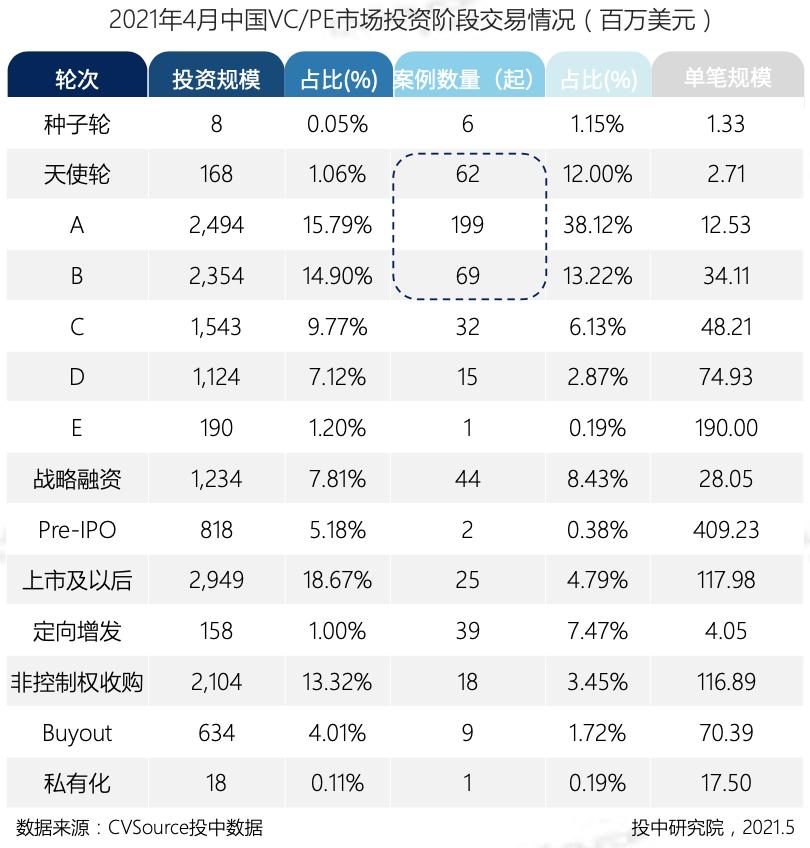 4月交易投资阶段集中于天使~B轮,合计占比超60%。