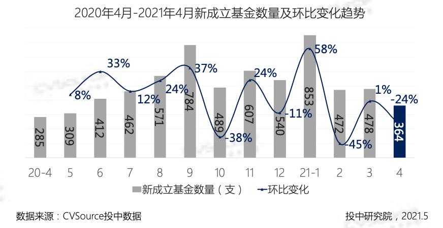 2021年4月,中国VC/PE市场新成立基金数量共计364支,环比下滑24%,同比涨幅28%。