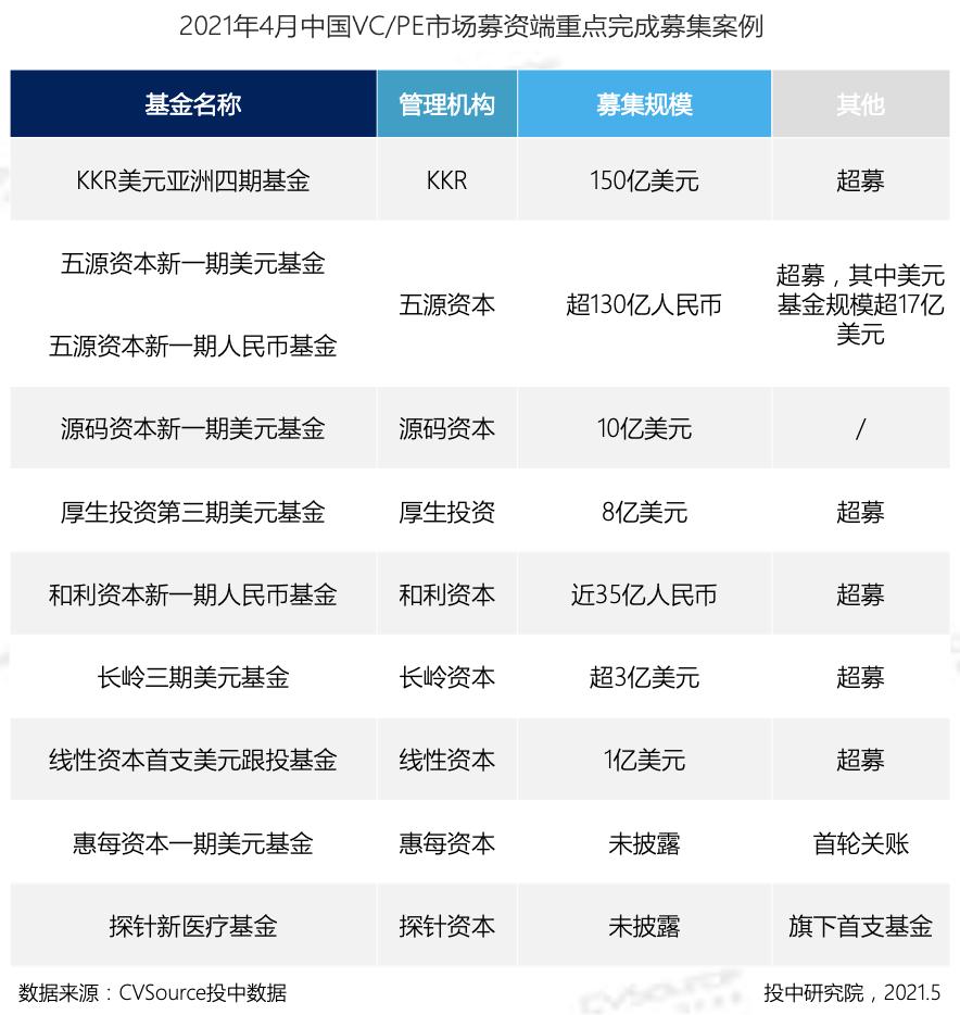 4月完成募集案例除了多为美元基金以外,还有一个特征是多数实现了基金超额认购,例如全球顶级投资机构KKR本期完成150亿美元的超募,该基金获得约290余个全球新老投资者的大力支持,其中包括踊跃的亚太地区投资者;五源资本(原晨兴资本),在短时间内便获得国内外新老LP投资人的全力支持和超额认购,新一期美元基金与人民币基金的募集规模合计超130亿人民币,其中新一期美元基金规模超17亿美元,包括早期基金与成长期基金。