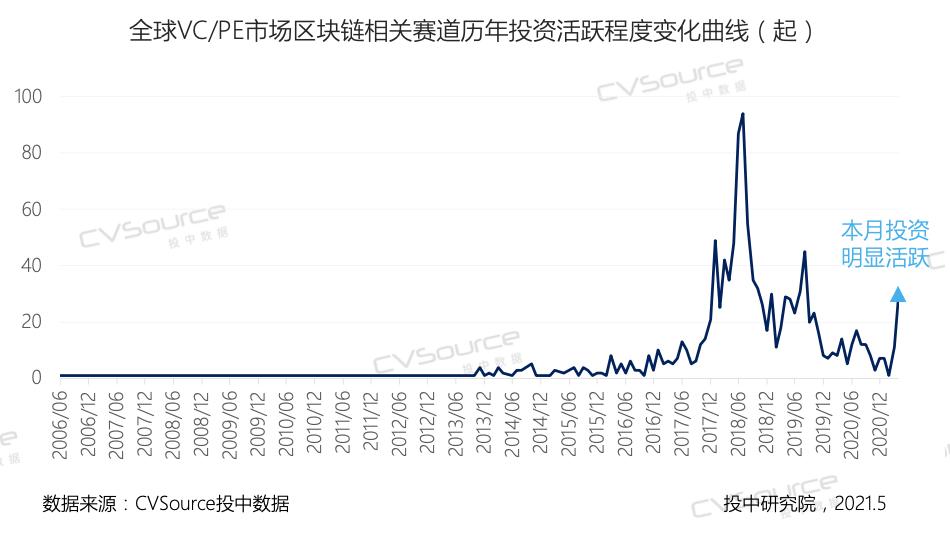 进入2021年后,全球市场下VC/PE机构在区块链领域的投资变得愈发活跃,尤其在4月,区块链相关赛道投资高达30起,同比增加超1倍。