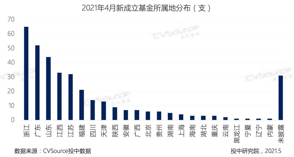 从地区分布来看,4月新成立基金集中于浙江、广东、山东、江西、江苏、福建等地,其中浙江、广东两省4月新设基金超50支。