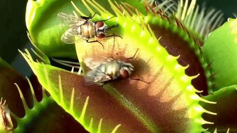 捕蝇草,是自然界中少数的几种食肉植物之一,它们的叶片上有多根触角,一旦有昆虫触碰到这些触角,叶片就会在不到一秒的时间里合拢,将小昆虫关在其中,直到它被叶片中的腺体分泌出来的消化液消化掉。有时连青蛙或小鸟等动物都会成为它们的腹中物。