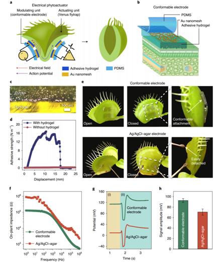 植物发出的信号很微弱,叶面毛茸茸又有蜡,一般来说很难连接到能导电的电极上。而NTU团队则开发了他们的植物“通信”设备,使用一种叫做水凝胶的柔软粘性粘合剂,在捕蝇草植物表面附着一个贴合电极,从而实现导电。