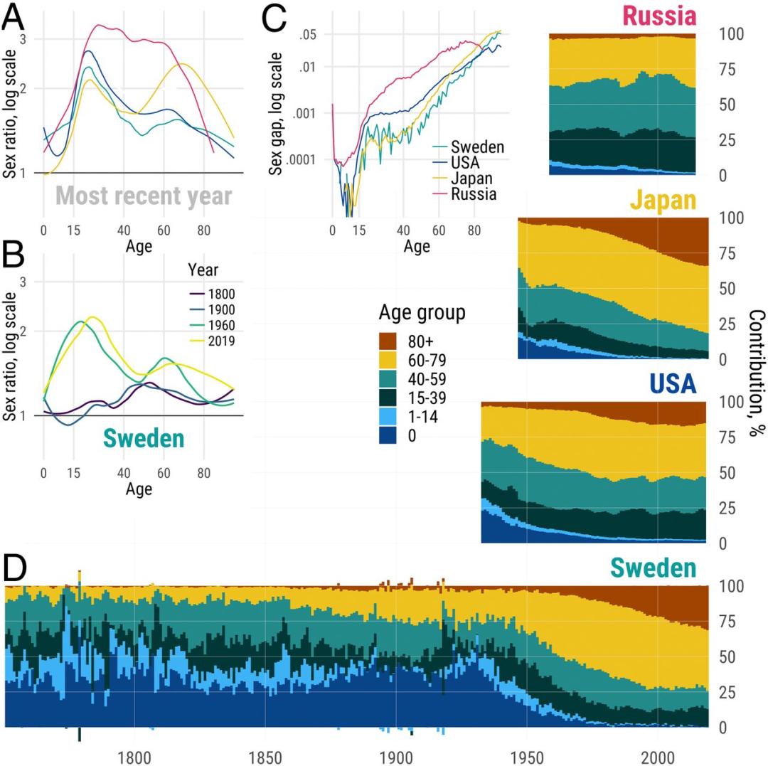 图 |(A)近年来四个国家中不同年龄段的男女死亡率比例;(B)不同年份瑞典各个年龄段的男女死亡率;(C)近年来四个国家的死亡率性别差异;(D)在俄罗斯、日本、美国和瑞典,随着时间的推移,对预期寿命性别差距的相对年龄特定贡献。