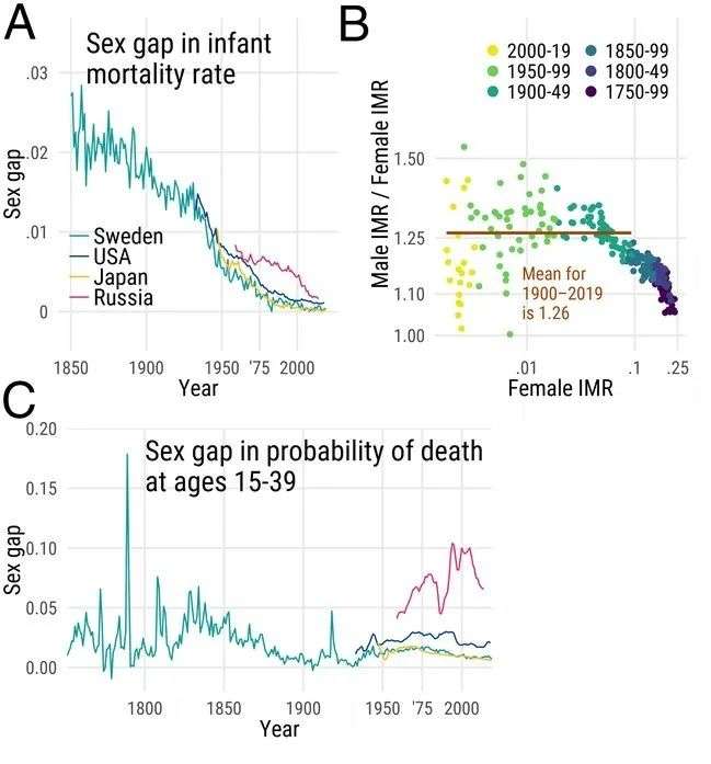 图 |(A)四个国家的婴儿死亡率中的性别差异;(B)按女婴死亡率水平划分的瑞典男女婴儿死亡率;(C)15-40 岁年龄段的死亡率性别差异,随着年份的不同产生的变化。