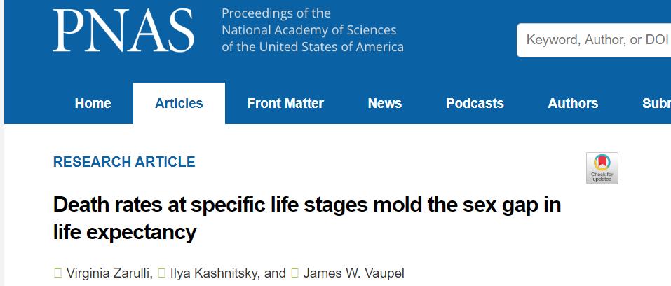 近日,来自南丹麦大学人口动力学跨学科中心(Interdisciplinary Centre on Population Dynamics)的研究团队,就在 PNAS 发表了一篇题为 “Death rates at specific life stages mold the sex gap in life expectancy” 的论文。