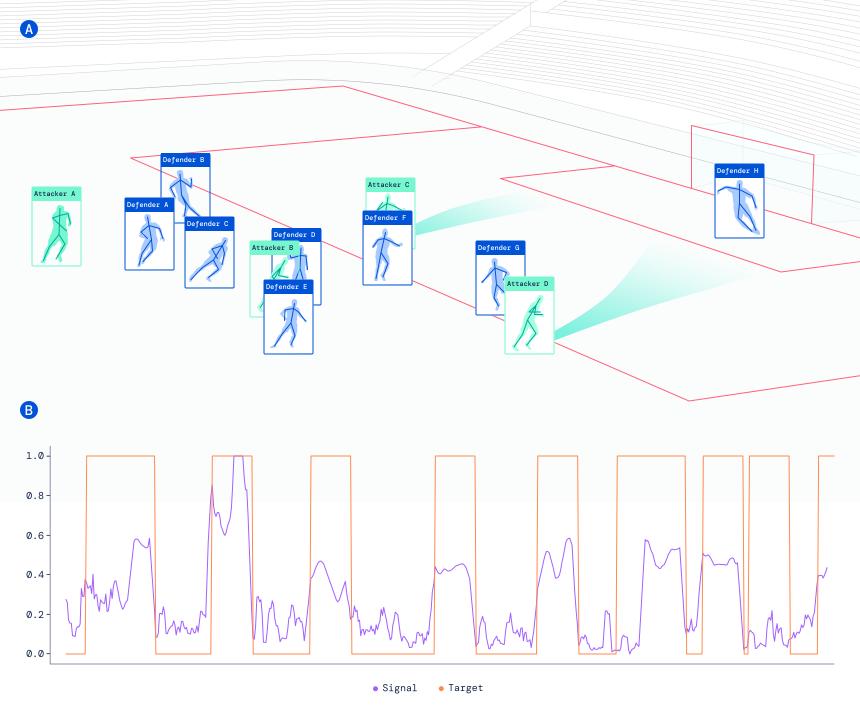 这篇论文展示了如何通过训练一个模型来预测一支特定球队和球员在特定情况下球员的反应: 例如,如果你在对阵曼城的比赛中将一个长球打入右手通道,凯尔·沃克会朝特定方向跑,而约翰·斯通斯可能不会这么做,他会做出别的应对。