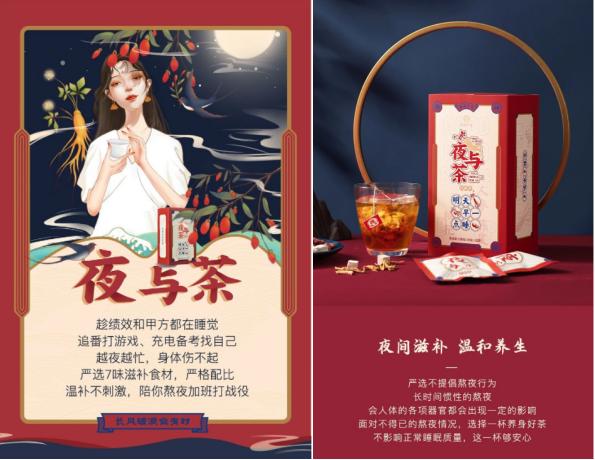 2020年,网易严选推出首款国潮设计的“夜与茶”,也称熬夜茶。瞄准当下年轻人“熬夜成瘾”的问题,使用老中医配方融入了“药食同源”的理念[4]。在产品设计上借鉴了民国时期的大字报风格,平衡了年代感与时尚感,从视觉、触觉、嗅觉和味觉上满足年轻消费者在审美、文化、情感等多方面的体验和需求。