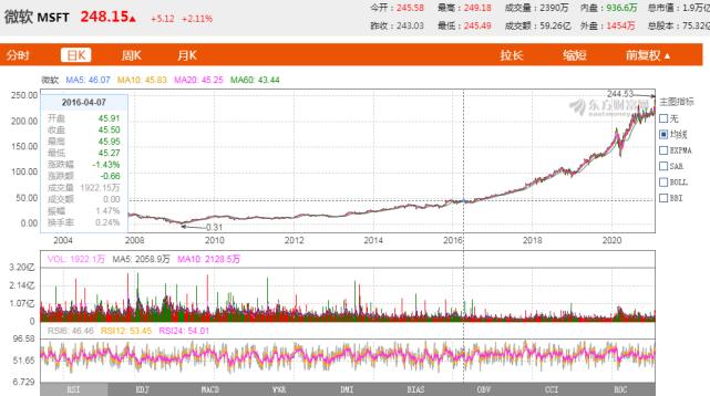 反映在股价上,从2016年来微软股价稳步上涨,从45美元左右上涨至240美元以上,重回巨头之列。