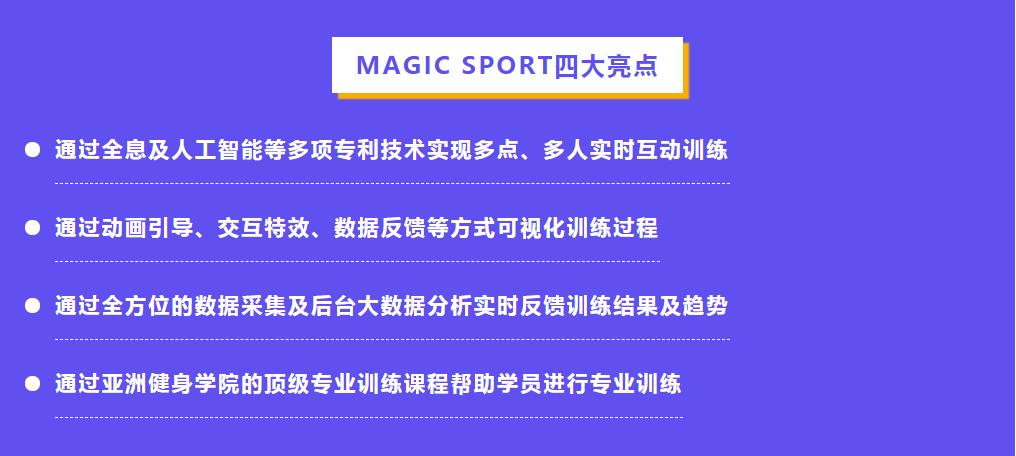 MAGIC SPORT是赛鲁班依托先进的人工智能技术打造的新一代智慧健身解决方案,拥有专业全息团操、专属私教训练、心率实时跟踪、AI运动评分、万能数字地胶、趣味互动游戏等六大类场景化训练产品,覆盖200+专业动作库,让健身训练更具乐趣、更有效果!