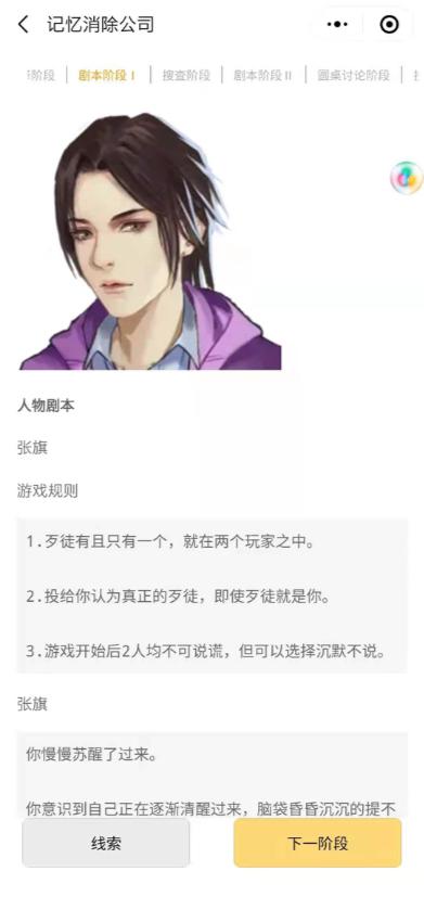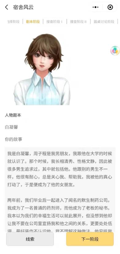 开始游戏后,首先是剧本阶段,此时玩家能够获得一些角色信息和剧情,玩家在进入下一个阶段后也可以随时返回剧本阶段查看剧情。