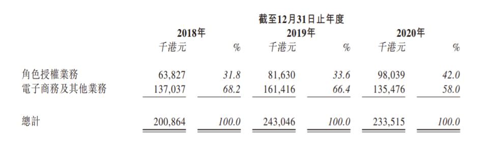 2018-2020年,小黄鸭母公司德盈的IP授权业务收入分别为6382.7万港元、8163万港元、9803.9万港元,营收占比从31.8%提升至42%。同期,通过电商和线下渠道的收入为1.37亿、1.61亿、1.35亿港元,营收占比分别为68.2%、66.4%、58%。