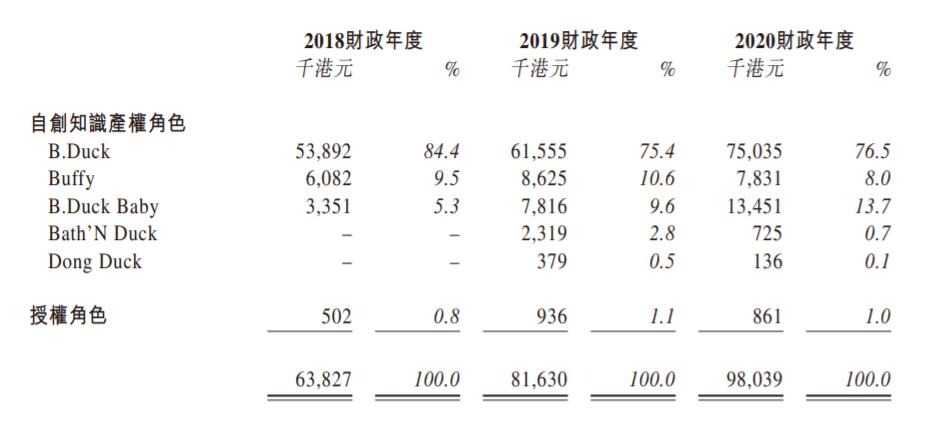 截至2020年末,德盈创作了多个角色,主要包括小黄鸭(B.Duck)、小黄鸭妹妹(Buffy)、小小黄鸭(B.Duck Baby)、为周冬雨创作的DongDuck,还有黑鸭子Bath’N Duck。但是从授权收入来看,还主要依赖小黄鸭(B.Duck),2018-2020年,小黄鸭授权收入分别为5389.2万港元、6155.5万港元和7503.5万港元,占同期授权业务收益的84.4%、75.4%和76.5%。
