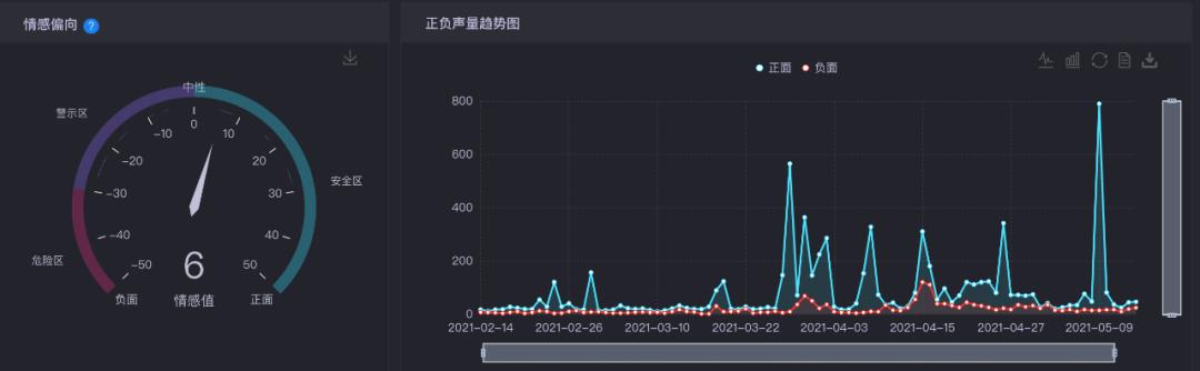另外,从情感值来看,杨天真处于安全范围,情感值为14,而且在以往参与节目的节点来看,杨天真可以说是事件型正面人物,阶段性的可以获得网友们的正面支持。