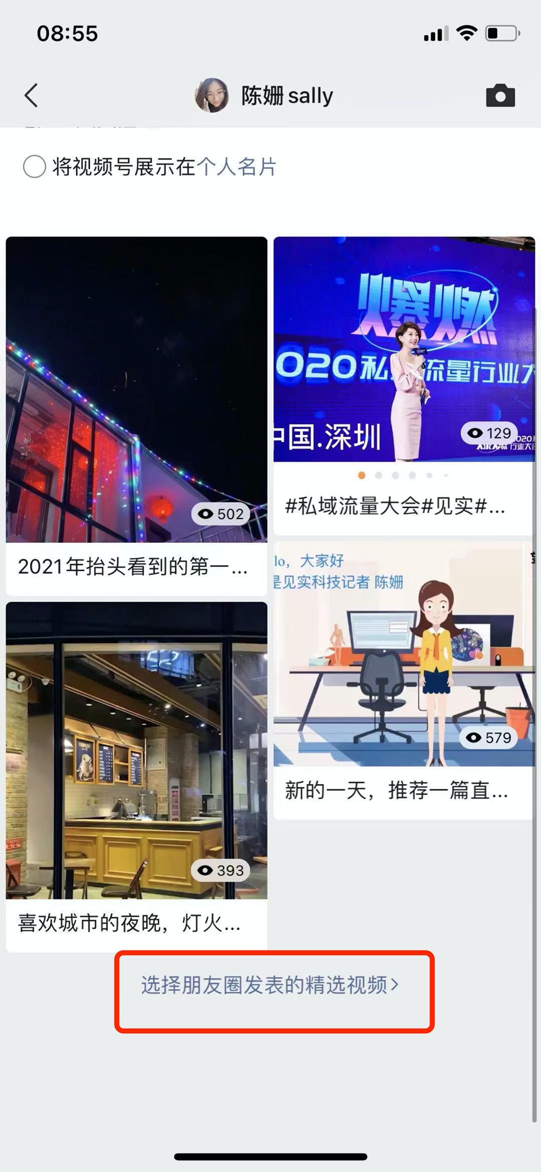 7)视频号主页最底部新增“选择朋友圈发表的精选视频”功能,点击即可选择之前朋友圈发过的照片和视频,发布到自己的视频号