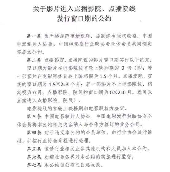 为此,中国电影制片人协会、中国电影发行放映协会全体会员,还制定签署了《关于影片进入点播影院、点播院线发行窗口期的公约》,约定窗口期为影片在电影院线首轮上映档期的2倍,希望约束市场行为。