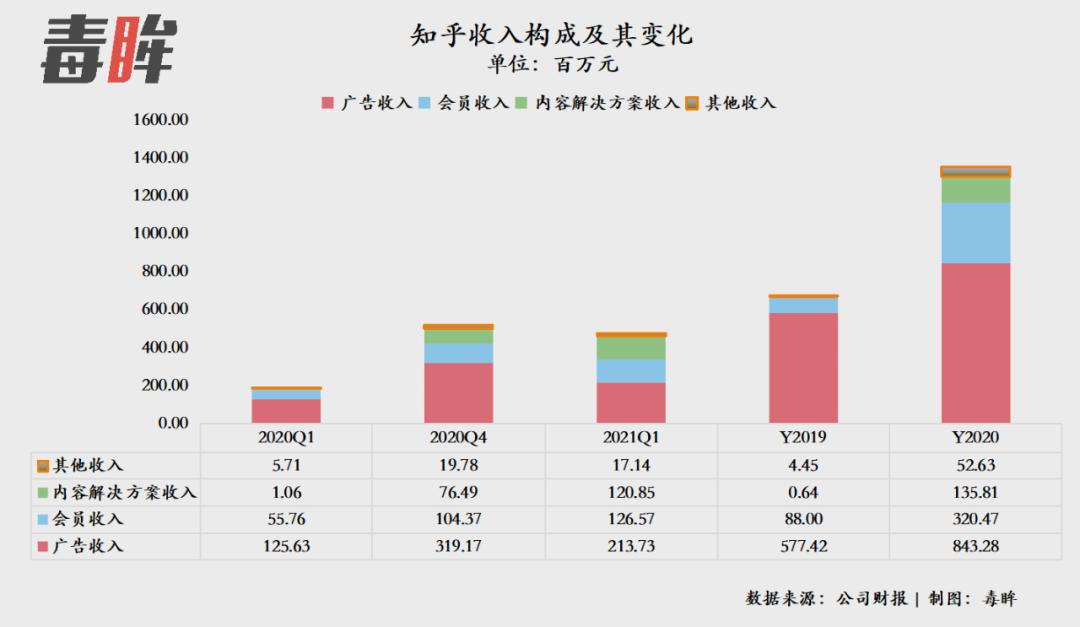 广告收入之前一直是最大收入来源,知乎有过度依赖广告的风险。2019年,广告收入5.77亿,占总营收的86.1%;2020年,知乎广告收入增至8.43亿,总营收占比降至62.4%。