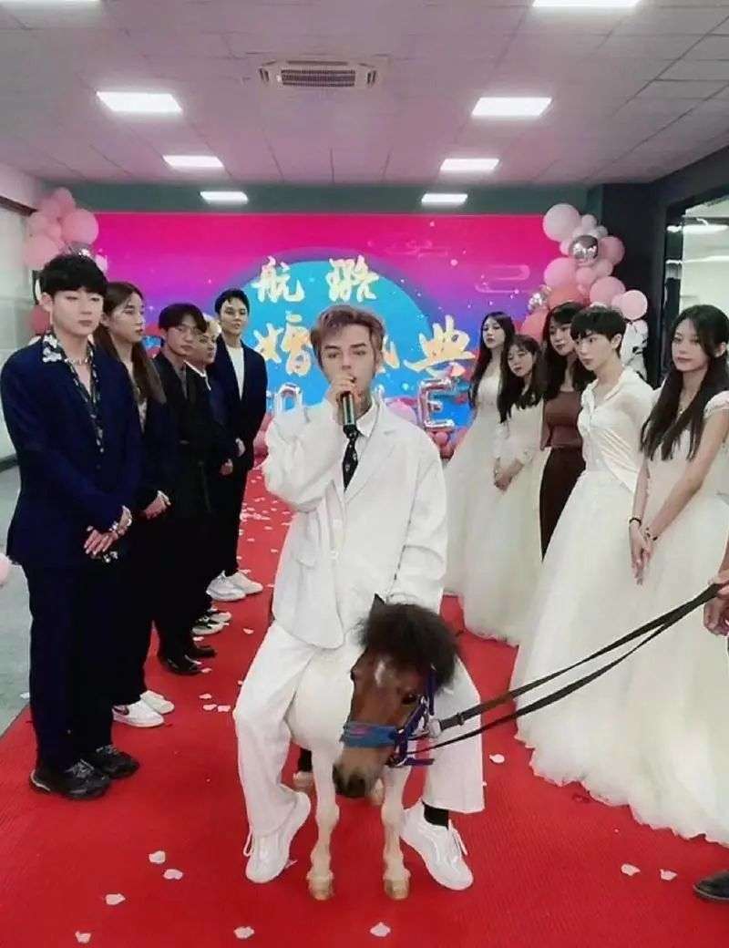 5月15日当天,订婚当天,殷世航身着一身白色西装、骑着一匹小矮马亮相,贡献了多个“抓马”桥段——在3名蒙着红盖头的女生之间找出女友,带着爸爸(花钱雇的演员)一起亮相,前女友追到现场撒泼等等,引发了围观者的“群嘲”。