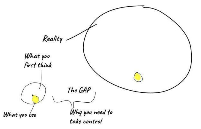 这样做决定很容易,很舒服,很直观,但不幸的是,它也助长了过度自信和夸大能力的感觉。无论我们的社会阶层或所谓的智力如何,我们在本质上都有 “认知误区”,也就是说,我们倾向于以肤浅和毫不费力的方式解决问题,而不是通过更复杂和努力的方式。如果不刻意解决,这种过度自信,以及一个人最初的想法和现实之间的差距(见上图),甚至会把最值得信赖的专家引入歧途。