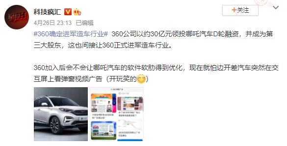 从战略投资哪吒汽车为切入口,360正式加入互联网造车的队伍。
