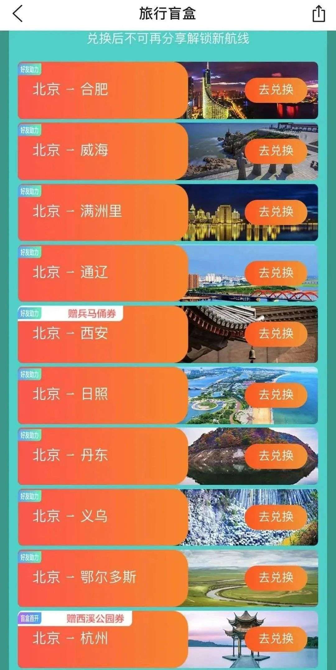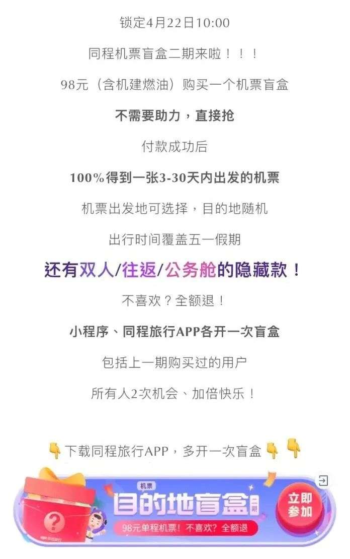 此外,产品的花样也在不断增多。同程在4月22日的第四期机票盲盒中即推出了双人、升舱的隐藏款产品;携程额外推出699元/999元的酒店盲盒;去哪儿网还新增了助力解锁航线活动,每增加三名助力即可多解锁一条航线,最高可解锁十条航线。