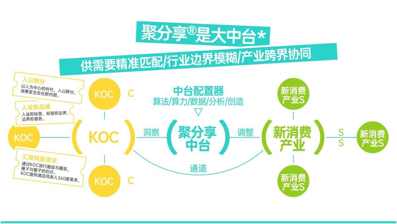 在第二阶段,聚分享将基于数字化中台为新消费品牌搭建社区分享平台,通过组织、营销、数据、算法、研发、设计、业务、内容八大中台,实现企业跨界营销、IP合作、用户需求洞察,协助企业整合品牌力,提供优质KOC资源,为企业构建差异化竞争力。