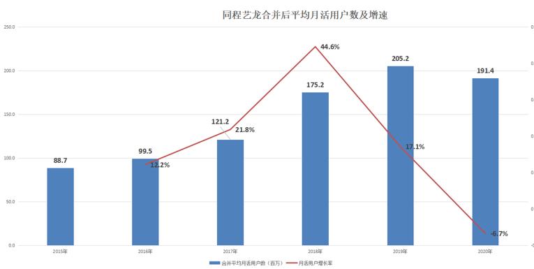 从用户角度来看,腾讯的助力确实帮助同程艺龙快速增长。按合并后去重口径统计,2015年至2019年,同程艺龙平均月活用户数由8870万人增长至2.05亿人,年化复合增长率接近24%。