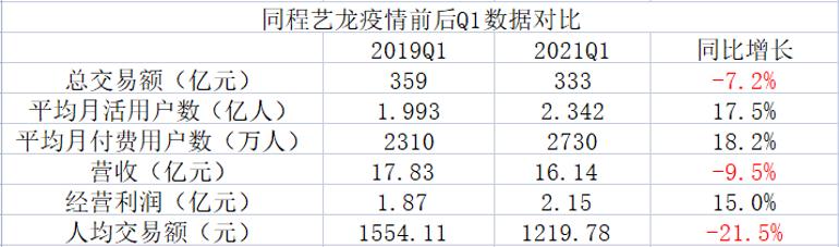 对比2019年和2021年Q1的核心经营数据,我们可以清晰的发现,虽然同程艺龙的总交易额和总营收分别下滑7.2%和9.5%,但整体用户体量却显著增长。
