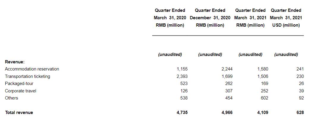 北京时间2021年5月19日, 携程公布了其截至2021年3月31日第一季度未经审计的财务业绩。