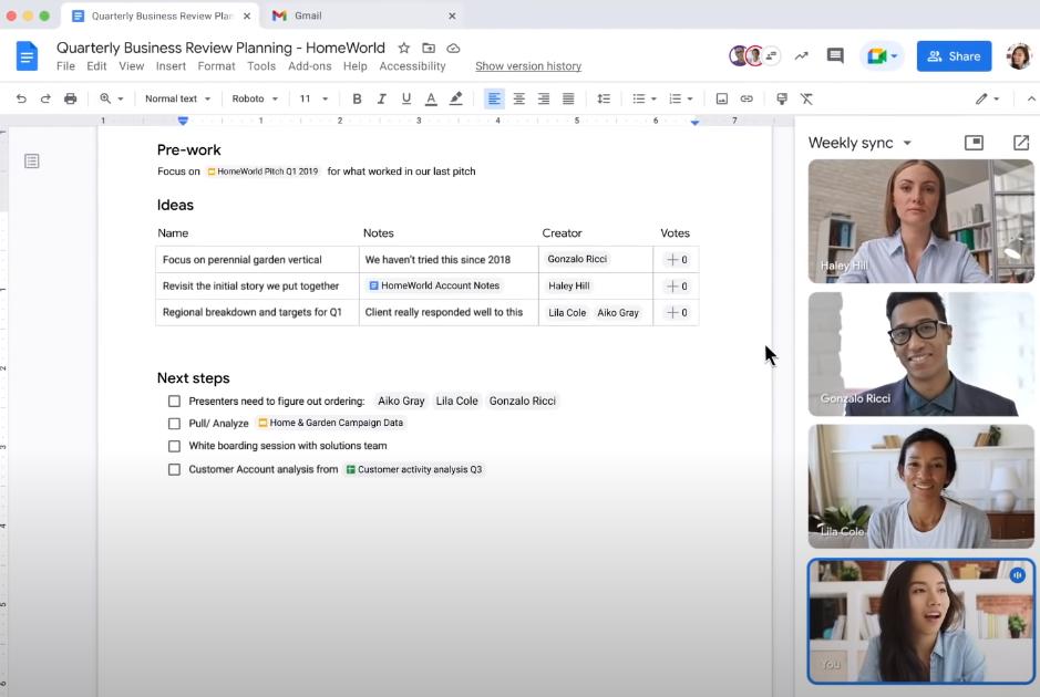 在文档写作的同时,团队成员还可以直接在文档页面上点击 Google Meet 按钮,一键启动视频会议,提高团队沟通的效率。