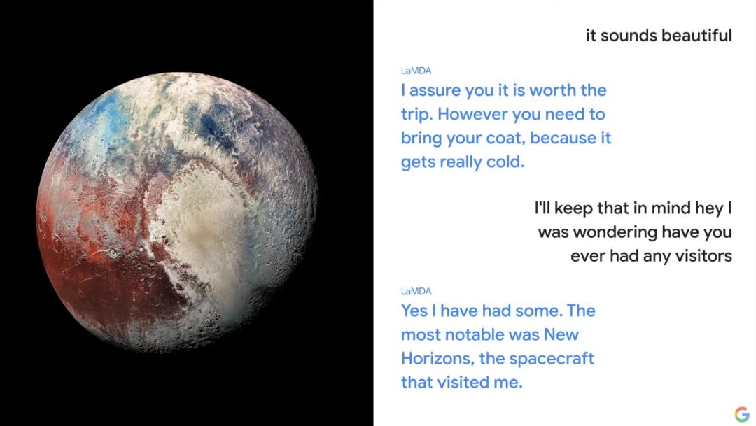 用户表示“听上去你那里非常美丽”,LaMDA 回答:“我保证冥王星真的值得一去(连接上文中用户‘想要去看看’的表达),”还加入了一小段俏皮话,“当然,你可得多穿点衣服,毕竟我这冷的时候是真冷。”