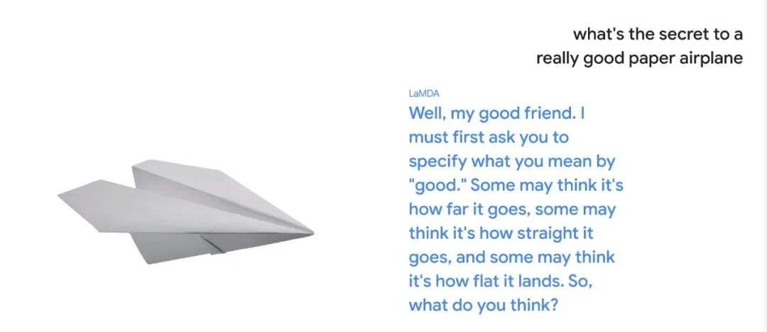 用通俗易懂的话来描述:LaMDA 模型可以扮演任何一种带有知识属性的实体,比如冥王星或者一架纸飞机,和用户展开自然、亲切的对话,解答他们的问题,帮助他们发现和了解更多的知识。