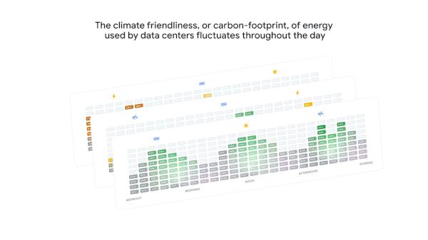 去年4月,谷歌发布了业界首个所谓的”碳智能计算平台“,按照清洁能源的供给情况智能地进行计算负载分配。这个平台工作的逻辑不难理解:地球的自转形成白天黑夜循环交替,也造成了气象变化和温差。那么谷歌可以把更多的计算负载分配到风能更充足的夜晚,以及太阳能更充足的正午。
