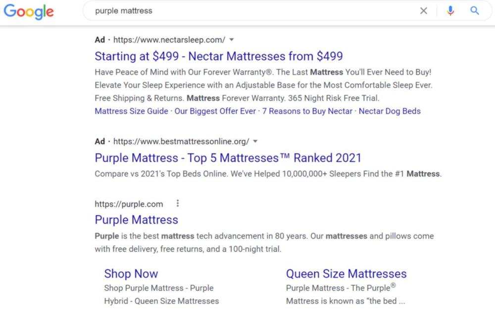 谷歌搜索床垫广告的例子