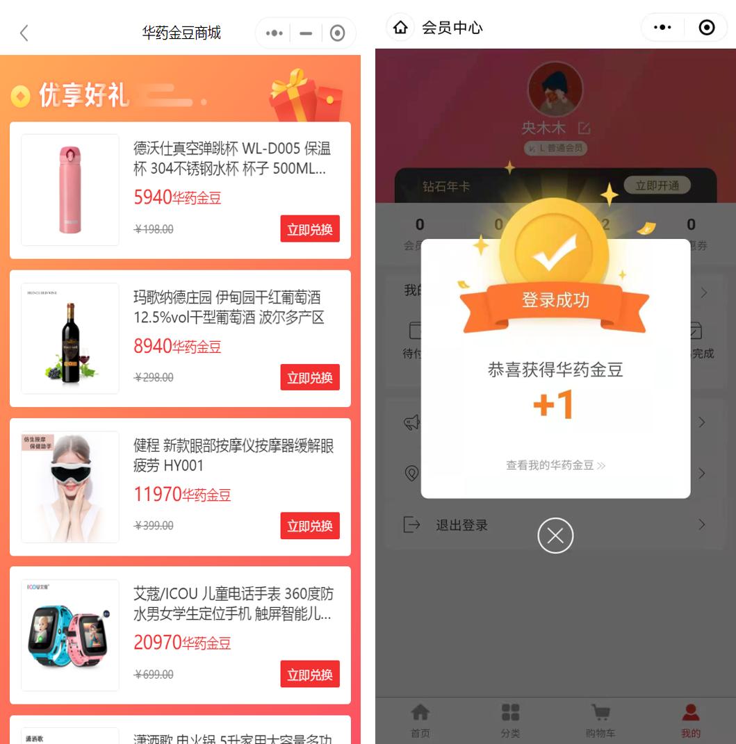 用户通过每日登录、打卡签到、下单消费、评价商品等举动可获取积分奖励(该积分在华药天康中以“华药金豆”的形式存在),积分商城可以积分换购,换取优惠券、现金券等等,以此提高客户打开商城的频次。