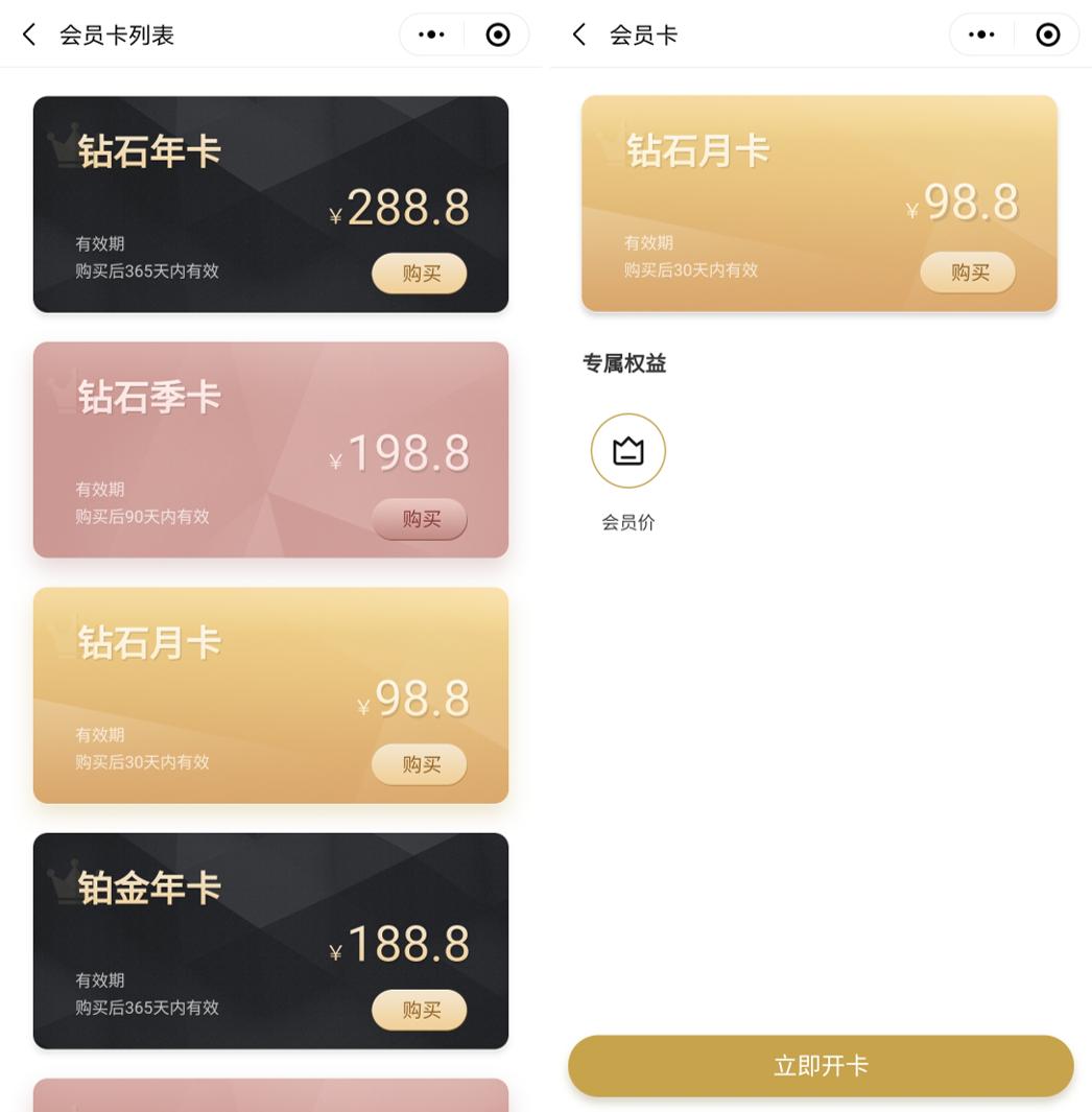 按照不同等级的会员则设定门槛,如:黄金卡、铂金卡、钻石卡,每种卡还按照月、季、年进行细分。